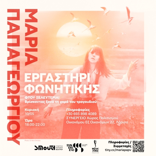 SYNERGEIO Culture space in collaboration with SMouTh, proudly organizes a four-hour vocal workshop with Maria Papageorgiou on Sunday, 10 May 2026 6.00pm to 10.00pm...