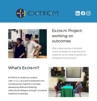 Το νέο newsletter του έργου EX.TRE.M (EXcellence in TheaTre with Migrants) έρχεται να μοιραστεί τις εντυπώσεις που δημιουργήθηκαν τον περασμένο Μάιο στις Βρυξέλλες μετά από μία -πλούσια σε ερεθίσματα και στοχασμό- συνάντηση. Νέες πρακτικές εφαρμόστηκαν στις ομάδες και πλέον η κοινοπραξία είναι έτοιμη να συγκεντρώσει το υλικό για τη δημιουργία του πρωτόκολλου αριστείας που προορίζεται σε εταιρείες θεάτρου που συνεργάζονται με μετανάστες.